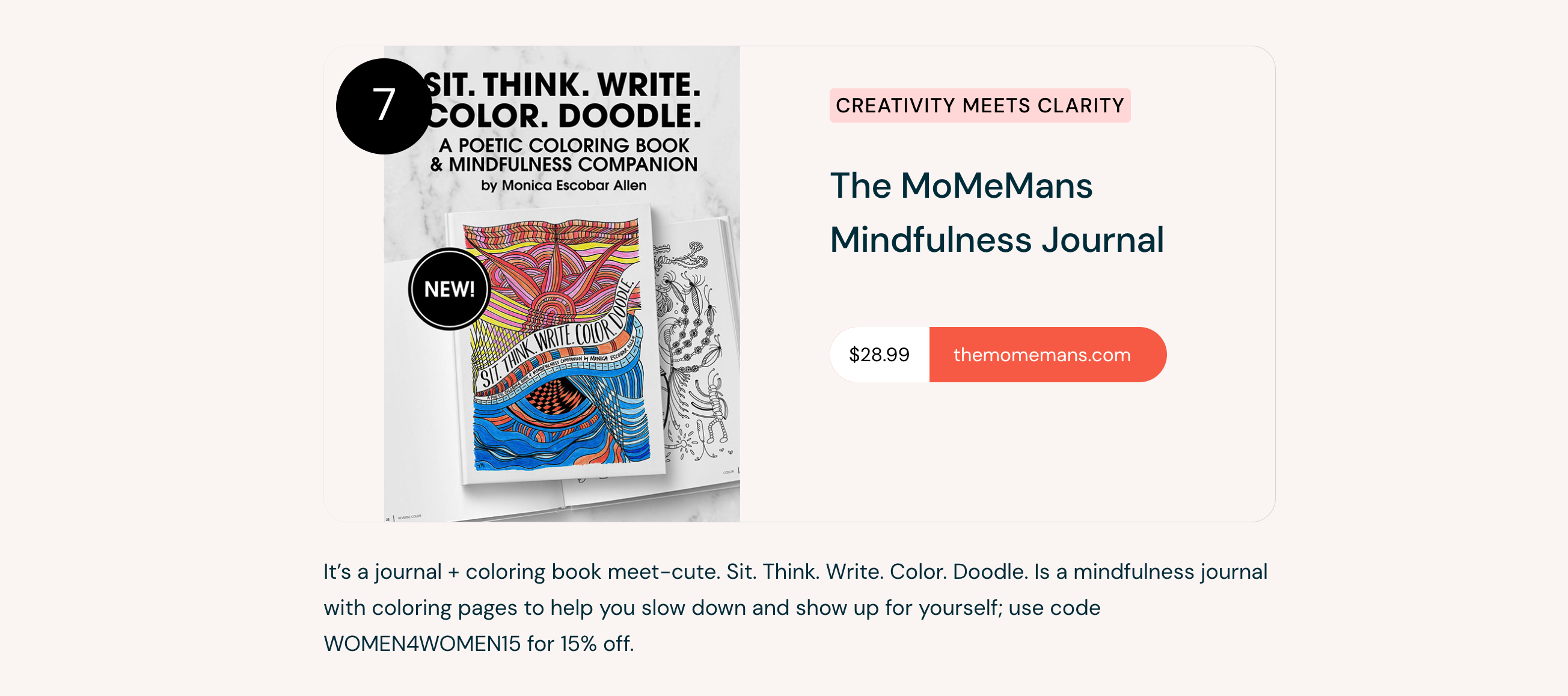 I am super excited to share that my poetic coloring book and mindfulness companion Sit. Think. Write. Color. Doodle. has been featured in the 2025 Holiday Wellness Gift Guide curated by Stephanie Cartin. The guide—titled 25 Wellness Gifts That Should Be on Your Holiday Wishlist—spotlights meaningful products made by women, for women, that support relaxation, self-care, and creativity. And we were #7 on the list!