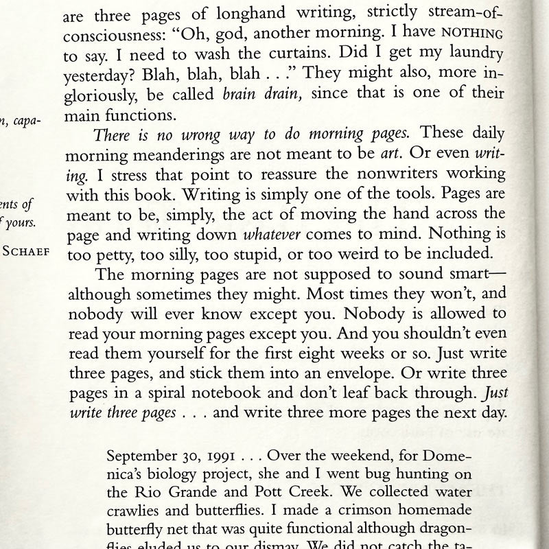 I was influenced by Julia Cameron’s The Artist’s Way and her practice of morning pages. When I’ve done them, I’ve felt more focused and grounded throughout my day. But then life happens, and the habit slips. Le sigh.